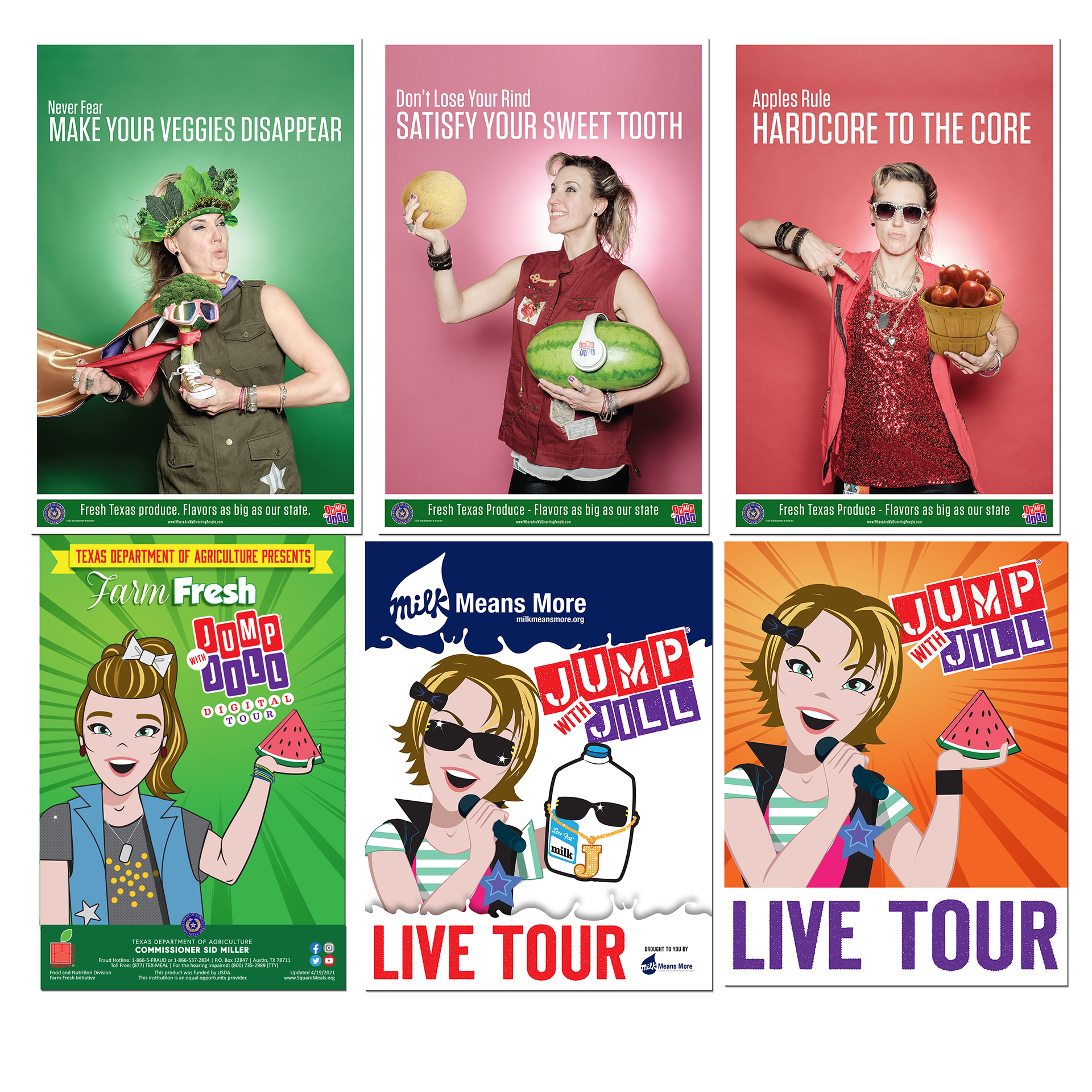 A selection of posters from various Jump with Jill tours. Client: Jump with Jill