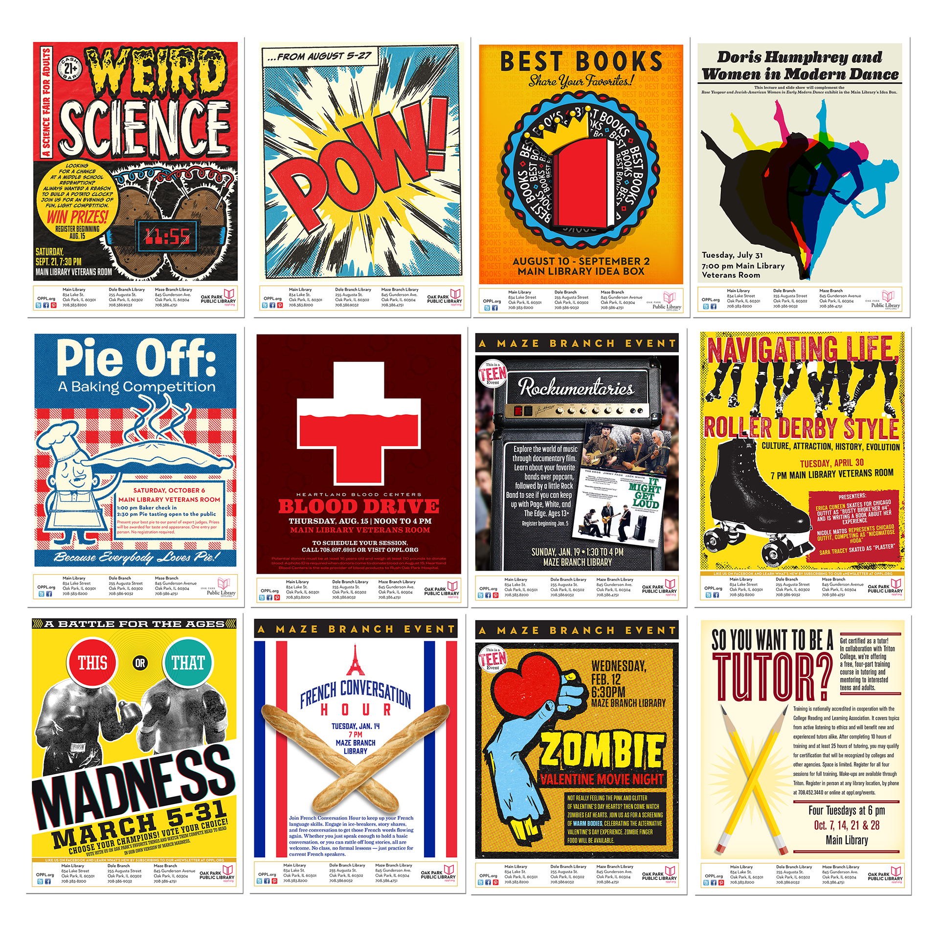 Selected posters promoting events at the Oak Park Public Library. Client: Oak Park Public Library