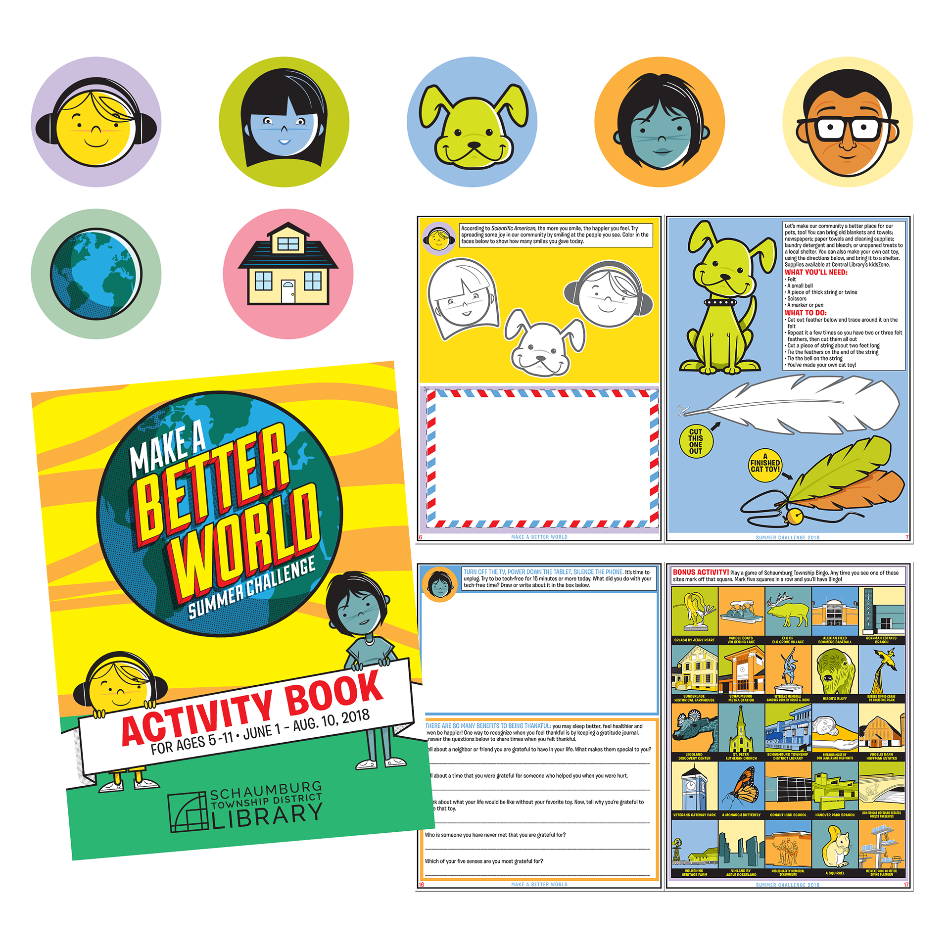 Graphics, workbook cover, and interior spreads for a summer reading promotion. Client: Schaumburg Township District Library