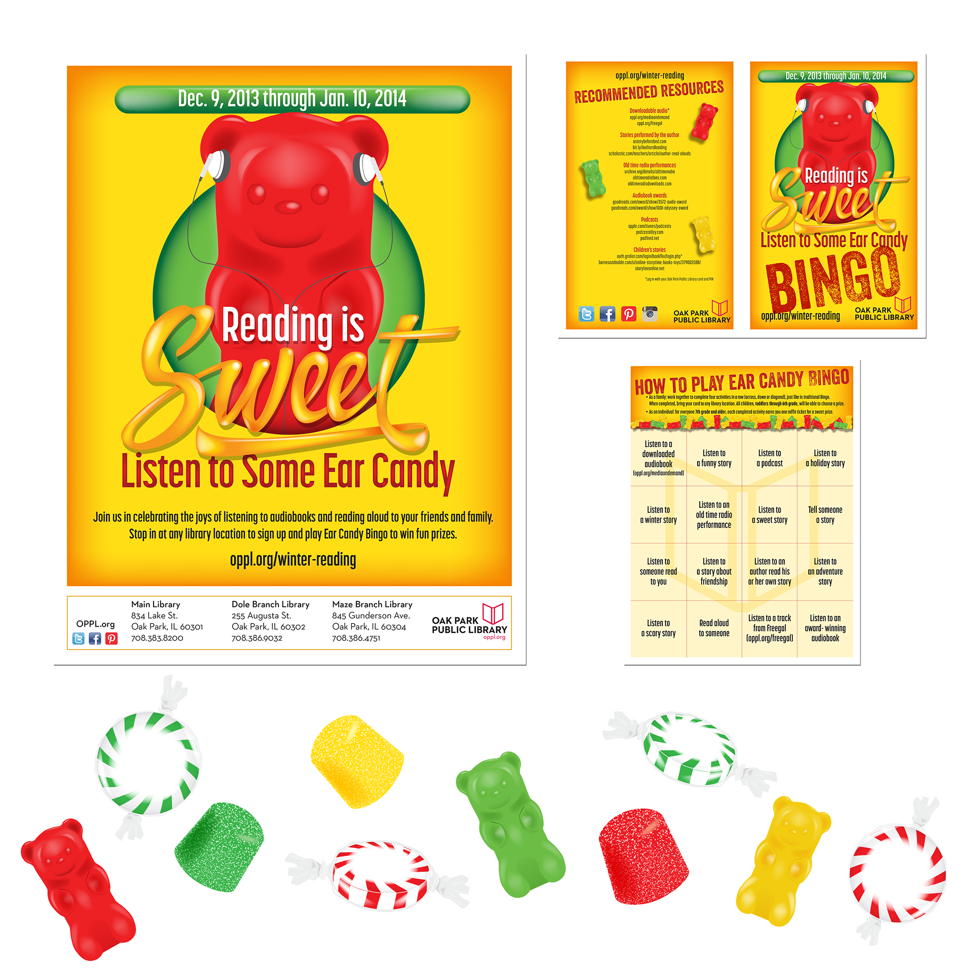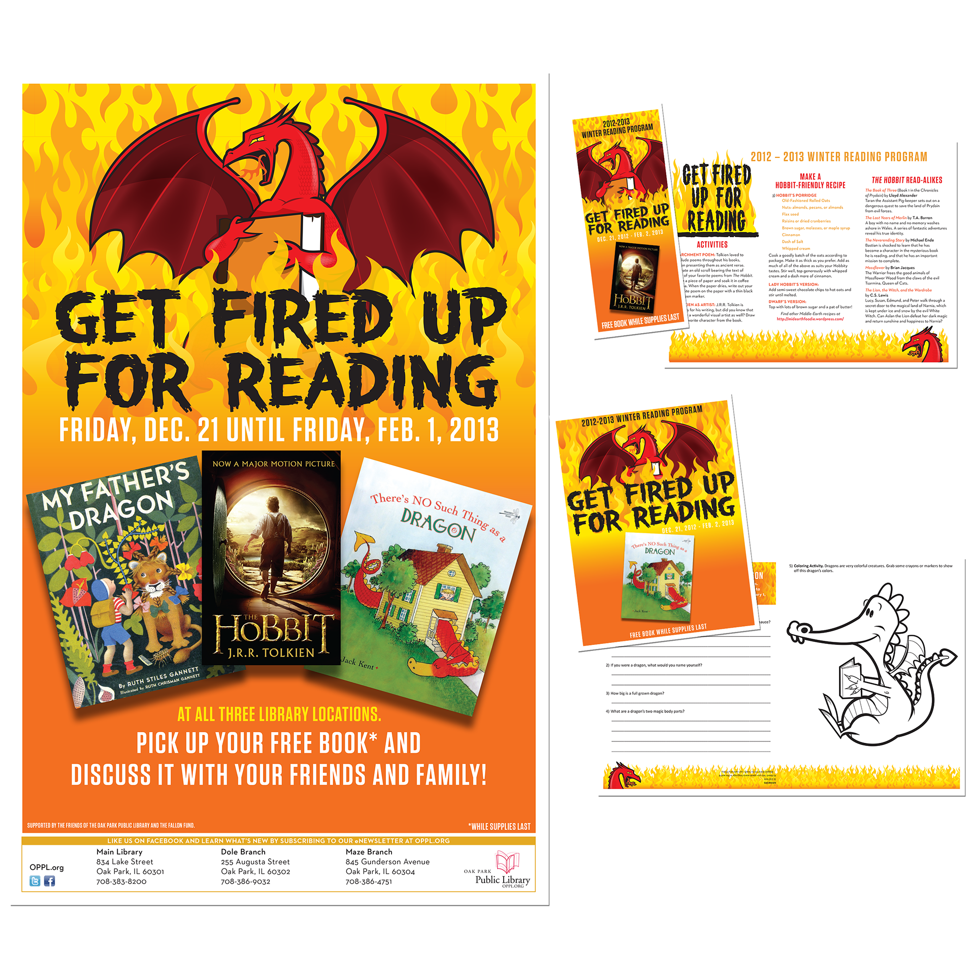 Poster, brochure, and worksheets for a winter reading promotion. Client: Oak Park Public Library