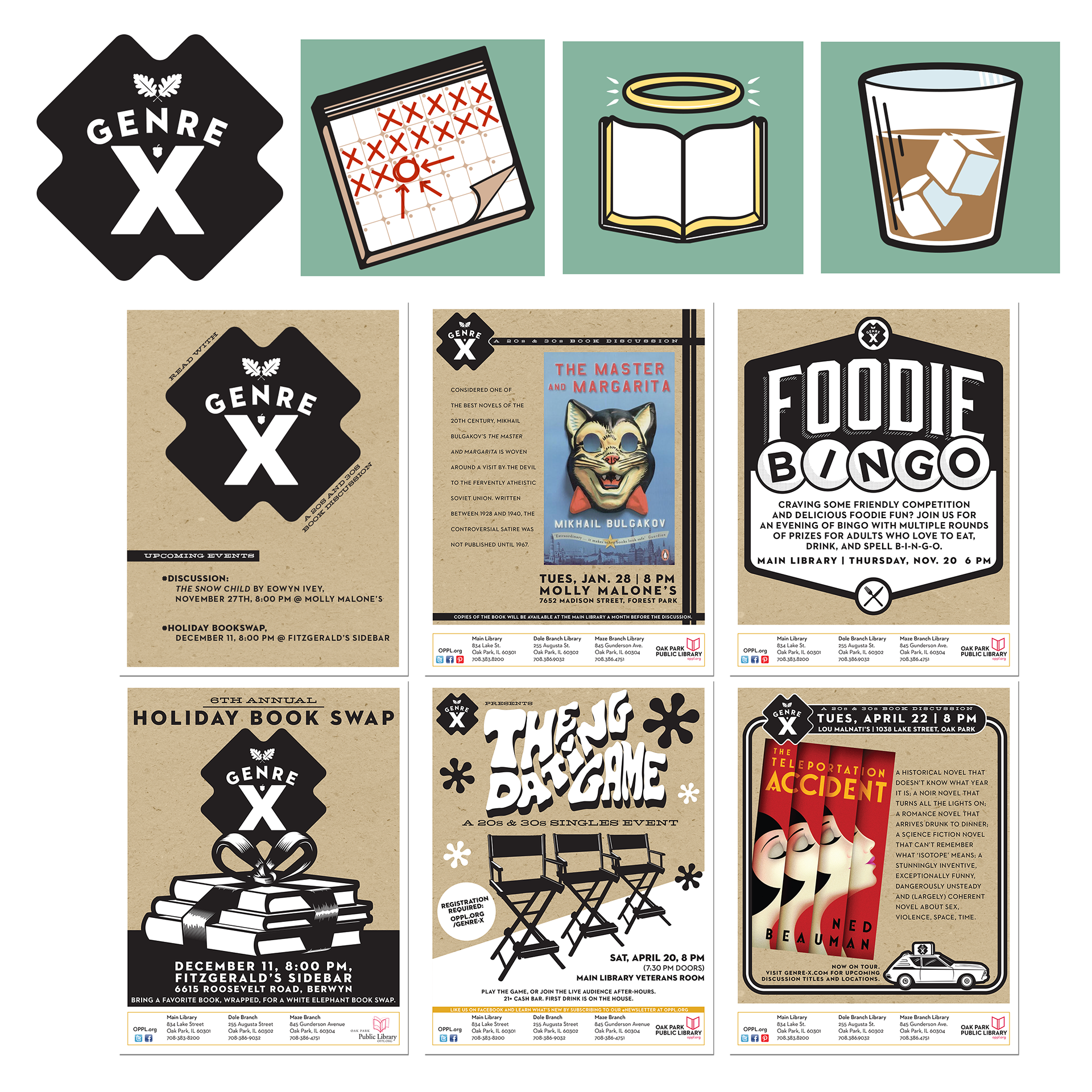 Logo, graphics, and branded events posters for Genre X, a reading group for 30-somethings. Client: Oak Park Public Library