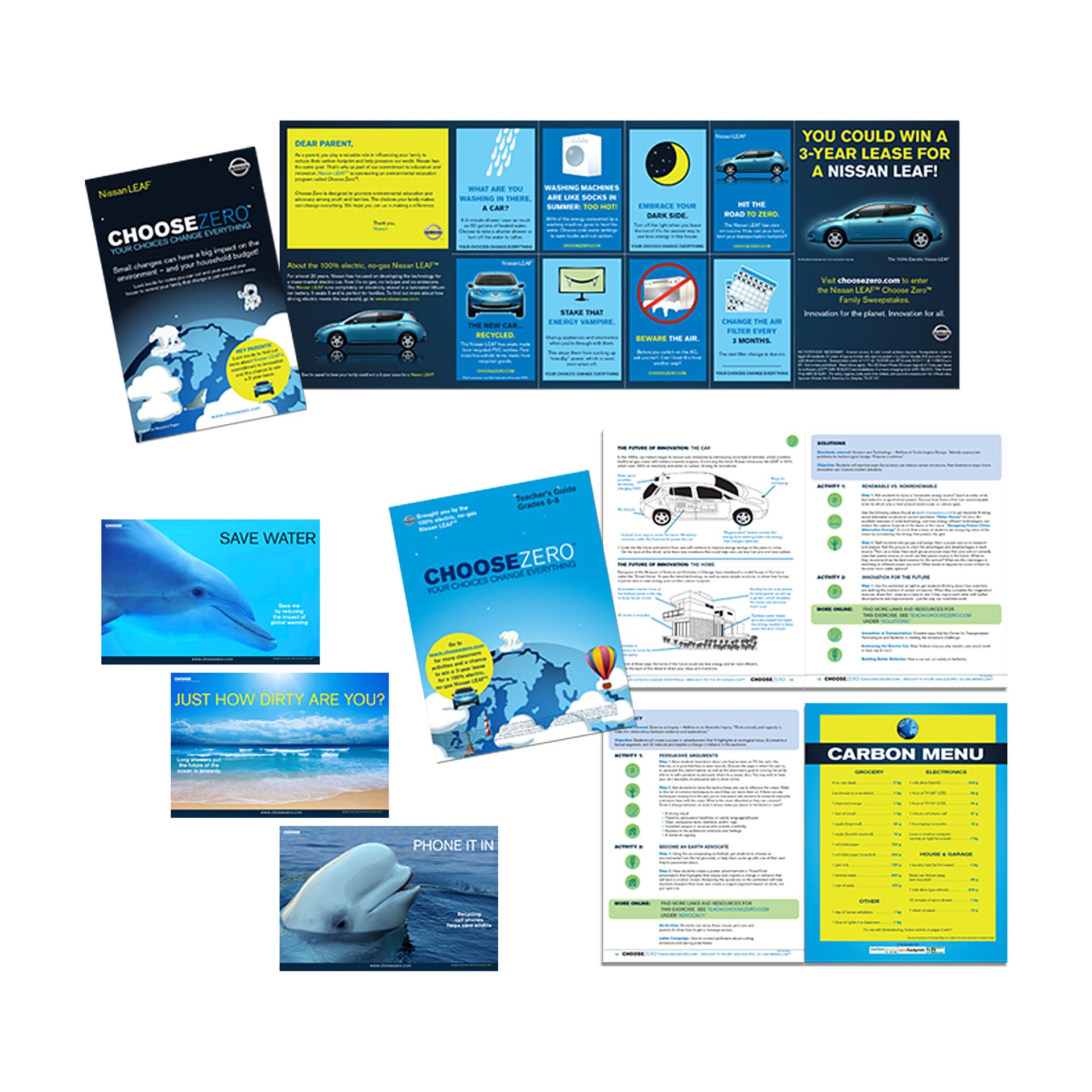 Educational marketing materials, including workbooks, postcards, and a brochure, promoting the launch of the Nissan Leaf. Client: Nissan