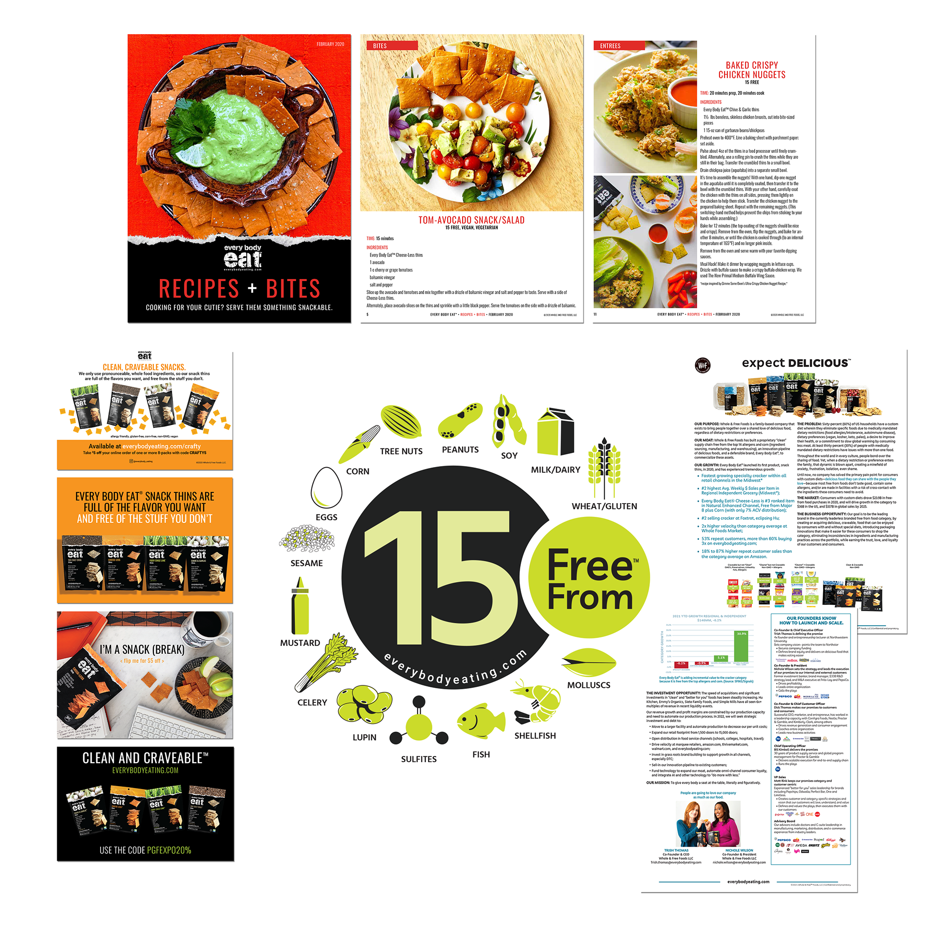A collection of recipe book pages, postcards, and marketing materials for a company the produces allergen-friendly foods. Client: Whole & Free Foods LLC.