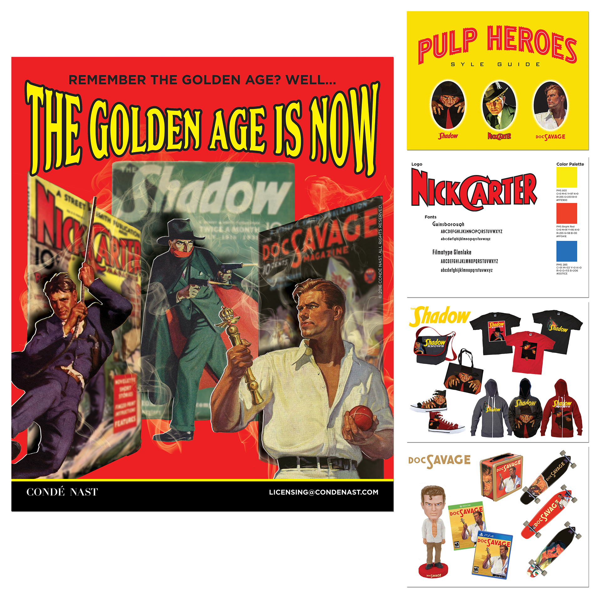 Magazine ad and pages from a style guide, including product mock-ups, promoting Conde Nast's licensing of their Street & Smith pulp properties. Client: Conde Nast