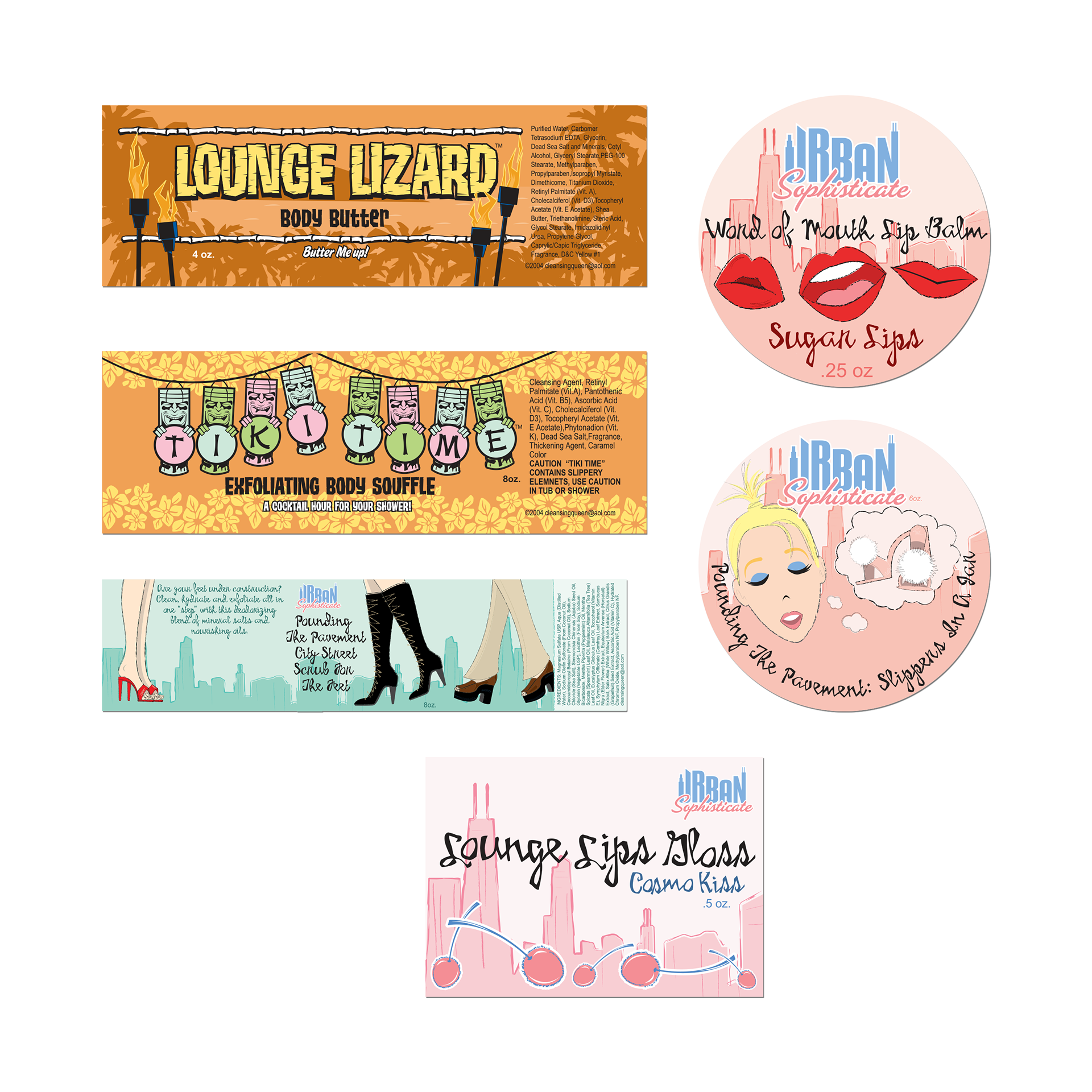 Packaging, illustrations, and logos for the Urban Sophisticate line of boutique cosmetics. Client: Urban Sophisticate