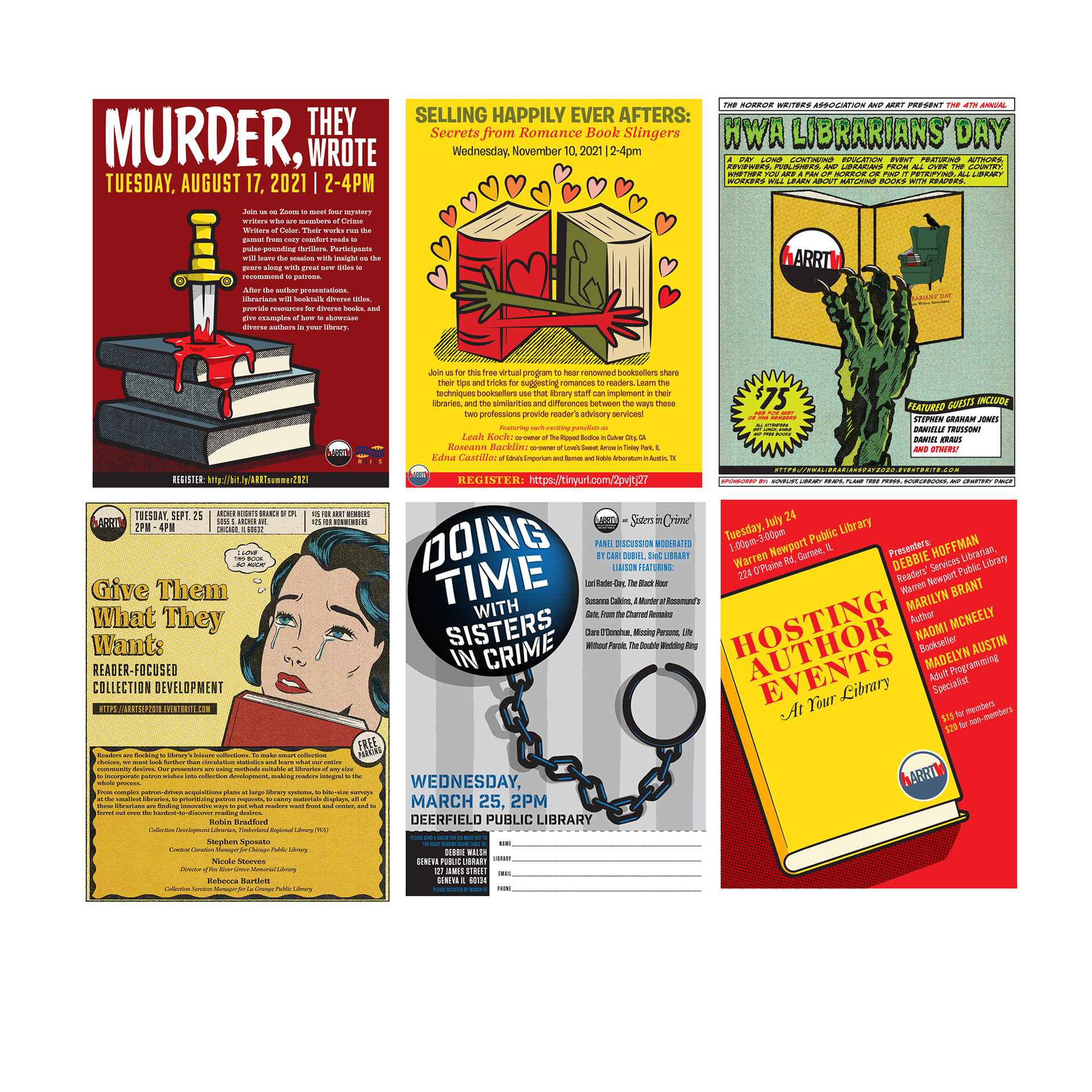 An assortment of flyers advertising events for librarians. Client: ARRT
