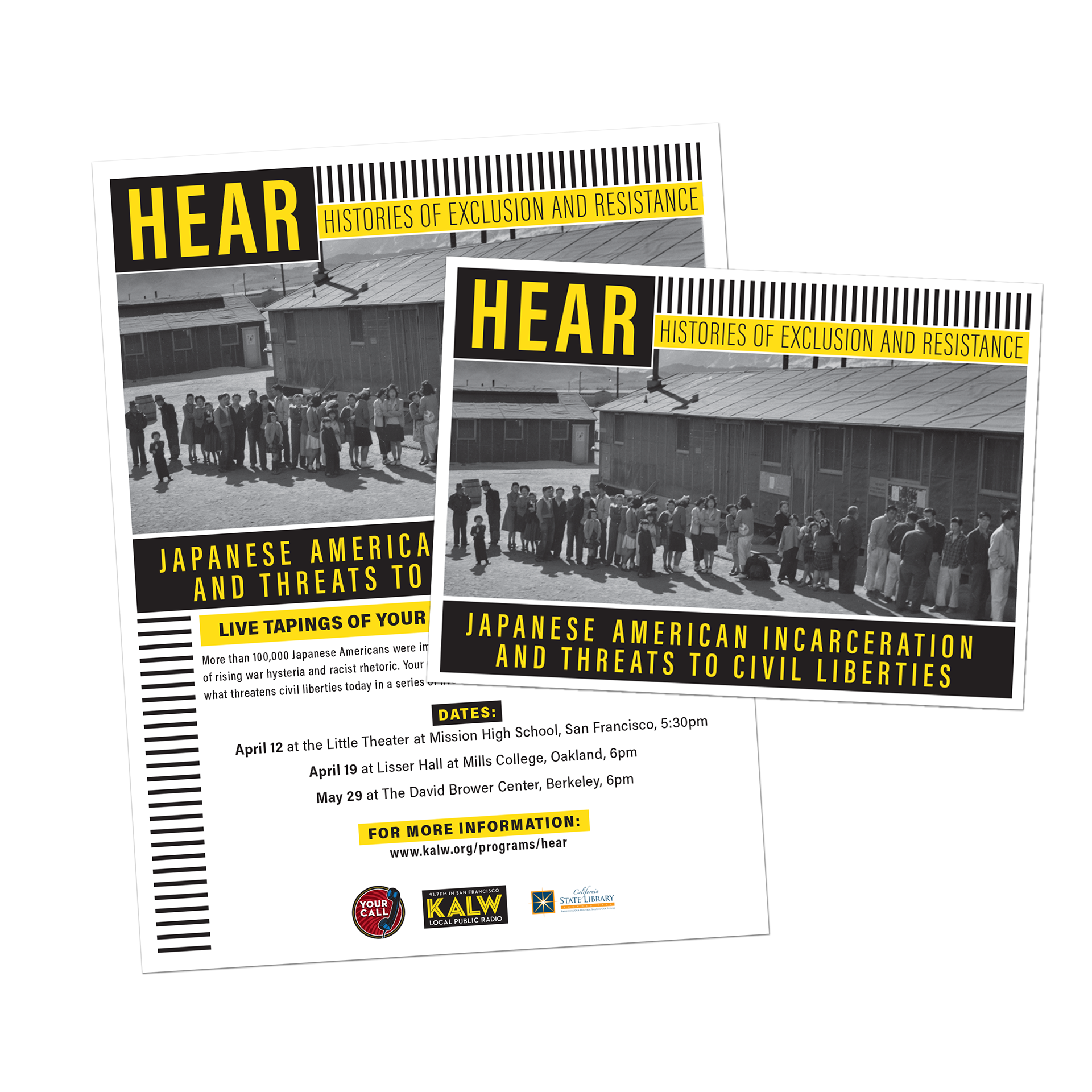 Postcard and flyer advertising live tapings of a radio show about Japanese internment camps during WWII. Client: KALW Public Radio